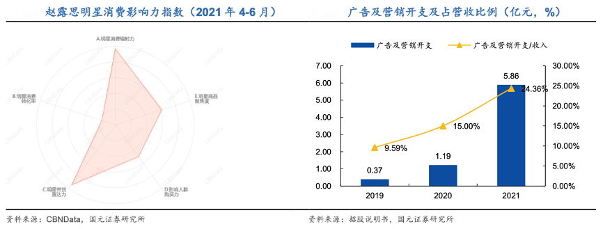 2021年8月蕉下邀請到明星趙露思成為其代言人,據 CBNData 統計,趙露思在明星帶貨直達力以 及明星消費輻射力均位于前列,其代言同樣大幅提高了公司品牌及產品的知名度。