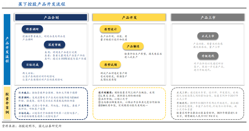 經典案例:根據招股說明書、國元證券研究所等綜合資訊表明,以蕉下公司代表性的產品膠囊系列傘為例,基于傳統傘具按鈕導致開合困難、體積大不便于攜帶和收納等消費者痛點,其進行調研發現消費電子產品和時尚配飾的特性后提出了膠囊系列傘的產品概念,在得到潛在用戶反饋后對設計進行了升級,最終于 2017 年正式上市;正式上市后,產品于 2019 及 2021 年有兩次升級迭代。