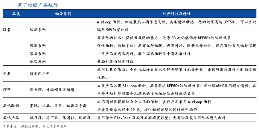 經典案例:根據招股說明書、國元證券研究所等綜合資訊表明,蕉下以雙層小黑傘起家,分別于2017/2019 年拓展至袖套、帽子/防曬服、口罩、等非傘類防曬品類。防曬品類以外,公司自 2021 年下半年起廣泛擴展產品組合涵蓋至非防曬產品,主要包括打底衫、褲裝、外套、圍 巾、帽子、鞋履、包袋等。2021 年蕉下天貓旗艦店有29.4%的客戶購買了兩款或以上的單品,彰顯了公司不同 產品及不同品類之間的強大交叉銷售能力。