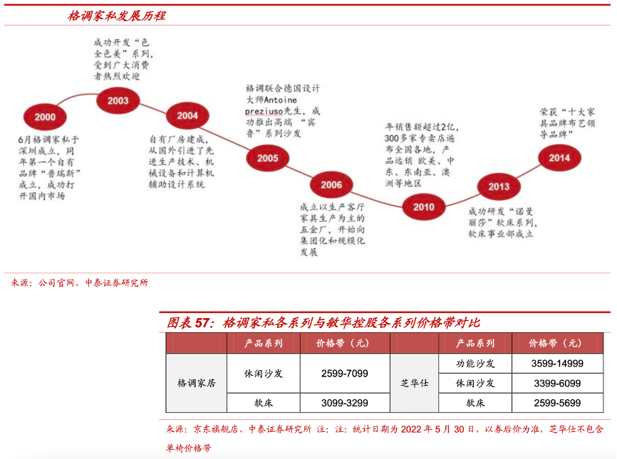 經典案例:根據公司官網、京東旗艦店、中泰證券研究所等綜合資訊表明,敏華公司于 2020 年 12 月 18 日與格調家私簽訂股權轉讓協議,正式成為格調家私控股股東。格調家私成立于 2000 年,旗下擁有“色全色美”、“格調時代”等高性價比休閑沙發品牌和“諾曼麗莎”軟床品牌,銷售網點遍布全國,終端銷售門店 800 多家。同時產品價格相對敏華較低,有利于推動價格帶進一步覆蓋更廣闊的消費群體。強強聯合下的協同效應將在未來長期加速敏華價格帶的下沉和品類端的完善。