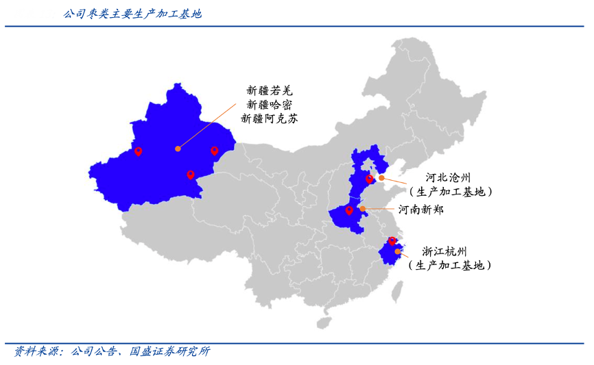 經典案例:根據公司公告、國盛證券研究所等綜合資訊表明,好想你在全國主要紅棗產地設立了生產基地。目前其已在河南新鄭、河北滄州、新疆若羌、新疆阿克蘇等四地設立生產基地。好想你于 1996 年便進入南疆,目前公司在南 疆直接經營的棗類種植面積將近 1 萬畝,直接簽約農戶 10 萬畝。