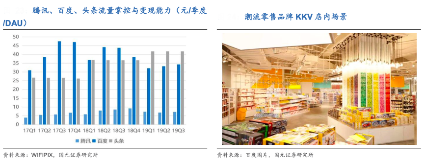 經典案例:根據WIFIPIX、百度圖片、國元證券研究所等綜合資訊表明,以三個頭部互聯網企業為例,按 DAU 口徑,百度在 2017Q1-2019Q3 的流量掌控能力和廣告變現能力下滑最為明顯,騰訊進入 2019 年后增長乏力,頭條系增速明顯放緩,可見中國互聯網流量 紅利開始進入衰退期。為控制成本,電商平臺通過滲透線下終端消費環節,強化精準 投放,同時,傳統渠道開始重視線上數據價值,新零售模式應運而生。