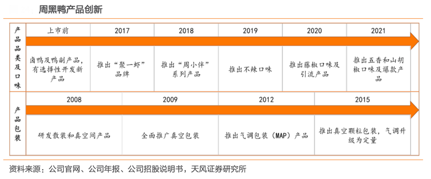 經典案例:根據公司官網、公司年報、公司招股說明書及天風證券研究所等綜合資訊表明,周黑鴨公司以鹵鴨及鴨副產品起家,有選擇性地開發新產品以迎合消費者需求。2017年,公司進入小龍蝦行業;2018年推出“周小伴”系列氣泡水和啤酒。2020年推出了藤椒系列產品及引流產品—真香鴨排和素菜系列;2021增加五香和山胡椒等新口味以及香辣蝦球、虎皮鳳爪等爆款產品,均 取得不錯反響。