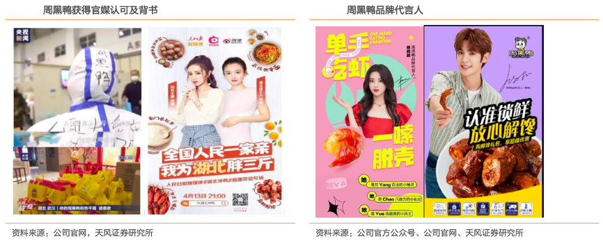 經典案例:根據公司官網、公司官方公眾號、天風證券研究所等綜合資訊表明,周黑鴨針對 90 和 00 后的核心消費群體,與偶像代言人合作,并在高勢能區域投放廣告來加強品牌的全國性知名度。2020年,其推出全新宣傳語—“沒滋味? 就吃周黑鴨”,以此植入消費者心智,進一步拓展年輕市場。