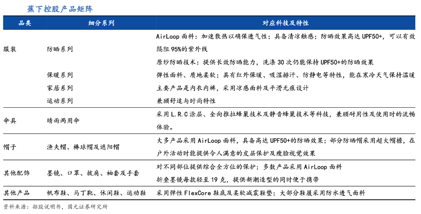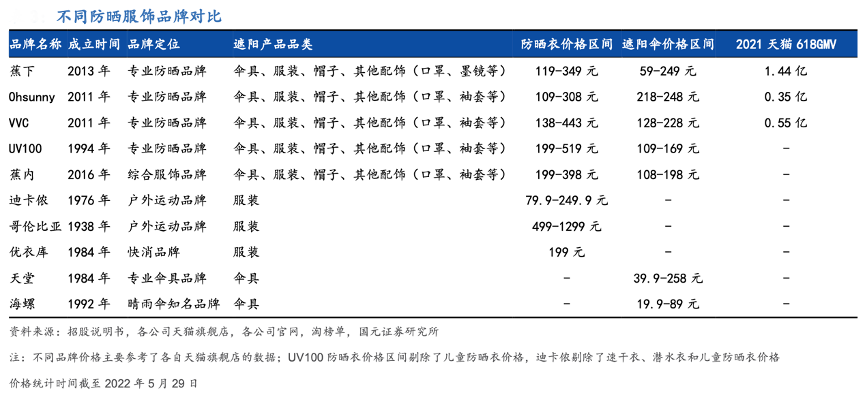 經典案例:根據招股說明書、各公司天貓旗艦店、各公司官網、淘榜單、國元證券研究所等綜合資訊表明,以蕉下為例,其果趣系列防曬傘與天堂防曬傘均滿足了基本的防曬性能以及便攜功能,但蕉下在滿足基本的防曬性能以外,其配備的可背傘包、傘底可作為拍照背景墻、購買頁時尚博主展示等元素均為促使消費者選擇更加昂貴的蕉下的重要因素。