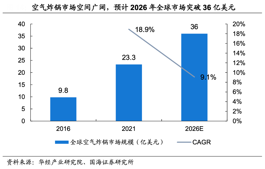 經(jīng)典案例:根據(jù)華經(jīng)產(chǎn)業(yè)研究院、國(guó)海證券研究所等綜合資訊表明,結(jié)合ZION統(tǒng)計(jì)數(shù)據(jù),2021年全球快餐市場(chǎng)規(guī)模約 6477 億美元,2028將達(dá)到 9980 億美元,高基數(shù)下2022-2028 年 CAGR 預(yù)計(jì)4.6%。空氣炸鍋烹飪的食品能夠帶來(lái)類(lèi)似快餐的口感,具有油炸替代屬性,故大體量傳統(tǒng)快餐市場(chǎng)為空氣炸鍋發(fā)展帶來(lái)天然空間。華經(jīng)產(chǎn)業(yè)研究院數(shù)據(jù)顯示,2021年全球空氣炸鍋市場(chǎng)規(guī)模 23.3 億美元,2016-2021年 CAGR18.9%。