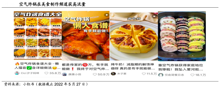 經(jīng)典案例:根據(jù)小紅書(shū)、國(guó)海證券研究所等綜合資訊表明,從內(nèi)容平臺(tái)上看,空氣炸鍋相關(guān)推文關(guān)注度高,小紅書(shū)平臺(tái)熱門(mén)筆記發(fā)布 4 個(gè)月內(nèi),單篇點(diǎn)贊量高達(dá) 51 萬(wàn)。從博主類(lèi)型上看,多為美食類(lèi) KOL 分享食物制作,少有好物分享類(lèi) KOL 推薦特定品牌,市場(chǎng)存在較大挖掘空間。