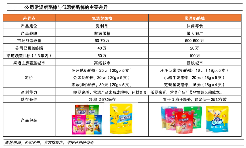 經(jīng)典案例:根據(jù)公司公告、官方旗艦店、平安證券研究所等綜合資訊表明,妙可藍(lán)多公司在 2021 年 9 月推出常溫奶酪棒產(chǎn)品,通過兩年多時(shí)間的研發(fā),解 決了低溫奶酪棒需要全程冷鏈的痛點(diǎn),極大地拓展了兒童奶酪棒品類的消費(fèi)場景。常溫奶酪棒可滲透市場空間比低溫奶酪棒更為廣闊,其在全渠道推廣上大有可為,走出冷藏冰柜的常溫奶酪棒食用場景更加多元。
