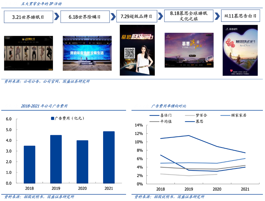 經典案例:根據公司公告、公司官網、招股說明書、國盛證券研究所等綜合資訊表明,2018-2020年慕思公司連續三年上榜中國品牌價值 500 強榜單,蟬聯中國寢具行業品牌價值榜首。在營銷活動方面,公司目前已成功打造出“3.21 世界 睡眠日”、“6.18 世界除螨日”、“7.29 超級品牌日”、“8.18 慕思全球睡眠文化之旅”和“雙 11 慕思告白日”五大貫穿全年的 IP 活動,部分活動已成為影響深遠的行業盛事。