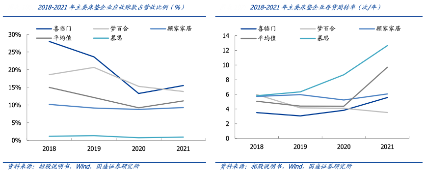 經典案例:根據招股說明書、wind、國盛證券研究所等綜合資訊表明,慕斯生產管理能力突出,以銷定產,優化庫存。其主要銷售自主品牌,且智能決策管理平臺通過集成 CRM、SAP、APS、MES 等系統,打通訂單一體化生產流程,并支持按需定制 C2M 商業模式,可以根據客戶需求迅速做出反應并進行排產,因此公司存貨周轉效率明顯高于可比公司,2021年公司存貨周轉率 12.64 次 /年,顯著高于喜臨門 5.56 次/年、夢百合 3.52 次/年,顧家家居 6.05 次/年。