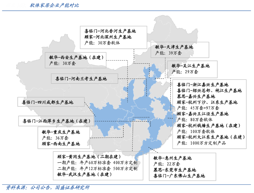 經典案例:根據公司公告、國盛證券研究所等綜合資訊表明,慕斯在供應鏈方面,通過集成 WCS 和 WMS 系統,有效提高快速供貨能力,提高生產效率、縮短交貨周期、降低生產成本,2021年公司獲授“數字化轉型大獎-標桿工廠”;產能方面,目前主要軟體家居企業均已實現全國化產能布局,喜臨門七大生產基地(不含在建萍鄉基地)更能滿足訂單及時響應需求。