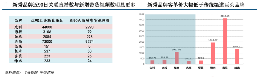 經典案例:根據飛瓜數據、中信建投等綜合資訊表明,對比新秀品牌與傳統渠道巨頭品牌比直播場次、新增帶貨短視頻數數據,新秀品牌均明顯領先。