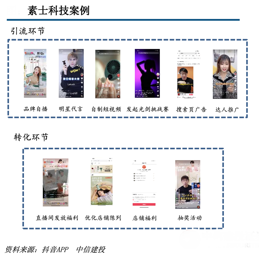 經典案例:根據抖音APP、中信建投等綜合資訊表明,素士科技起步階段完成了運營模式的探索,同時引入了店鋪的首批目標客戶群。進入到成長階段的品 牌,關鍵在于基于摸索出的運營模式實現GMV的迅速擴大。尤其是在轉化環節,品牌則應在原有基礎上繼續優化直播間、店鋪的運營。此外,在這一階段,品牌通常可以通過“爆款搭售其他產品”的方式適當提升客單價,從而進一步促進GMV的提升。