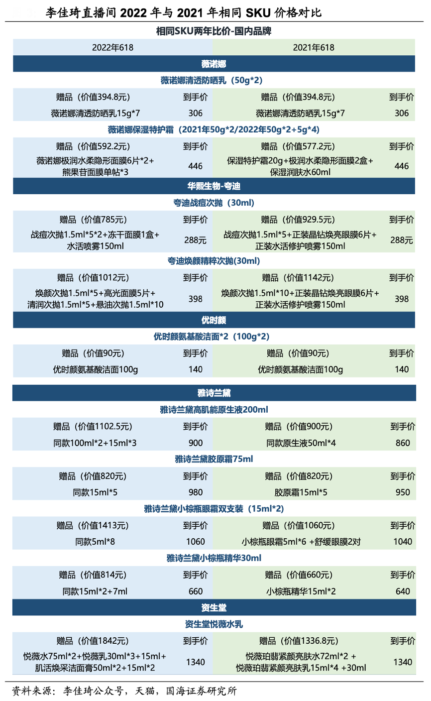 經典案例:根據李佳琦公眾號、天貓、國海證券研究所等綜合資訊表明,和往年 618 大促相比,2022年品牌普遍折扣力度更大,主要是以加大贈品價值的形式。受到2021年下半年部分品牌漲價的因素影響,部分 SKU 到手價格可能會高于 2021 年 618 大促價格,但由于品牌加大贈品力度,總體而言,最終的折扣力度依然大于 2021 年618 活動折扣力度。