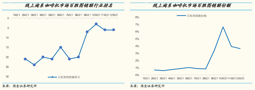 經(jīng)典案例:根據(jù)天貓APP、國金證券研究所等綜合資訊表明,小熊咖啡機(jī)產(chǎn)品目前主要覆蓋滴漏式 、半自動(dòng)意式咖啡機(jī),同時(shí)小熊近年來積極拓展新品類,咖啡機(jī)更多作為品類上的補(bǔ)充與嘗試,公司采取外協(xié)代工方式且布局 SKU 相對(duì)較少,21 年各月線上咖啡機(jī)市場中的份額亦相對(duì)有限(不超過 1.5%)。