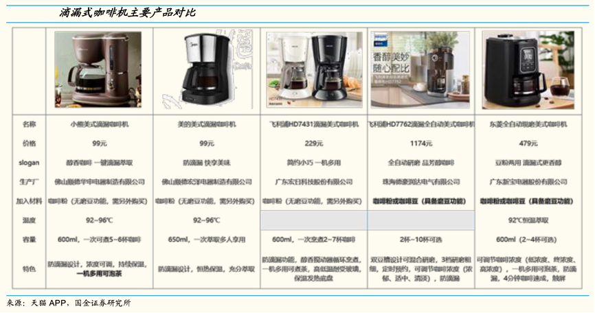 經(jīng)典案例:根據(jù)國金證券研究所等綜合資訊表明,滴漏式咖啡機(jī)的技術(shù)門檻相對(duì)較低,行業(yè)內(nèi)均價(jià)基本在百元左右,國產(chǎn)品牌以高顏值和性價(jià)比獲得一定的領(lǐng)先地位。根據(jù) 3 月 9 日天貓咖啡機(jī)好評(píng)榜單來看,小熊品牌滴漏式咖啡機(jī)以高性價(jià)比(99 元)和一機(jī)多用等特色獲得消費(fèi)者青睞,位居榜單前列。