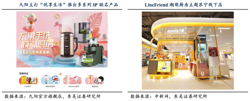 經典案例:根據九陽官方旗艦店、中新網、東吳證券研究所等綜合資訊表明,為進一步抓住趨勢順應年輕化消費群體崛起趨勢,九陽與潮萌品牌進行跨界 IP 合作,推出以LineFriends為代表的潮萌小家電,打造“高顏值”產品,滿足千禧一代消費群體為代表的新需求,建立文化認同與品牌共鳴。