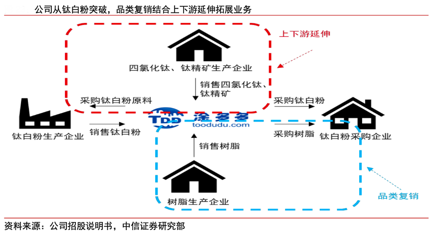 經(jīng)典案例:根據(jù)公司招股說明書、中信證券研究部等綜合資訊表明,國聯(lián)股份涂多多在進(jìn)入鈦行業(yè)時,先將鈦白粉作為核心單品進(jìn)行突破,發(fā)展了一批鈦白粉生產(chǎn)上游企業(yè)和需要鈦白粉的塑料、涂料生產(chǎn)的下游企業(yè)作為客戶。公司在采購銷售鈦白粉的基礎(chǔ)上,與鈦白粉生產(chǎn)商建立了良好的合作關(guān)系,捕捉到鈦白粉生產(chǎn)商對四氯化碳和鈦精礦等產(chǎn)品的需求,從而將四氯化碳和鈦精礦納入涂多多的采購體系,低成本擴(kuò)展公司業(yè)務(wù)和客戶。