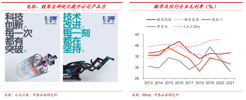經典案例:根據公司公告、wind、中泰證券研究所等綜合資訊表明,敏華在 2019 年突破歐式小型鐵架生產后,不斷攻克難題,逐步研發出“零重力平躺”、“零靠墻”、“美觀吊腳”等新型功能鐵架,實現尺寸小、美觀、輕盈、平躺等升級功能,助力公司功能沙發產品力升級,更加適應消費者需求。