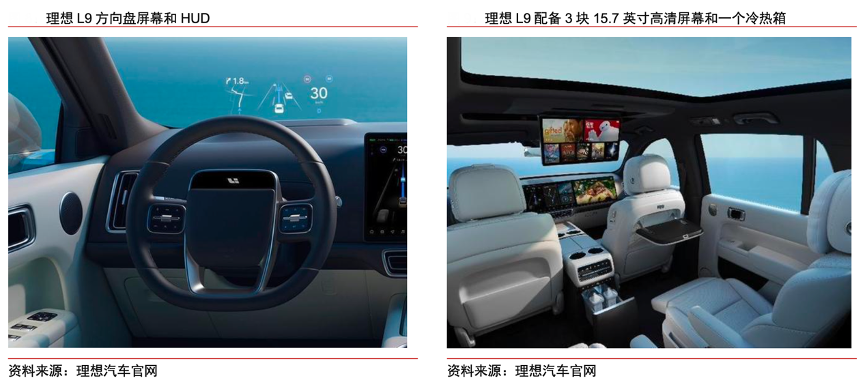 經典案例:根據理想汽車官網、中信證券研究部等綜合資訊表明,基于理想汽車官微,理想L9的創新多多,如超強的計算平臺,智能座艙標配兩顆高通驍龍 8155 芯片,配合 24GB 內存和 256GB 高速存儲組成的計算平臺,為 AI、軟件和娛樂提供強大的計算能力。