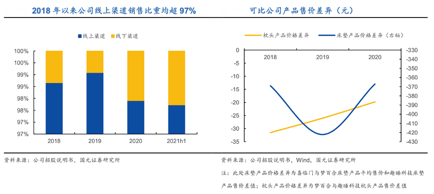 經(jīng)典案例:根據(jù)公司招股說明書、wind、國元證券研究所等綜合資訊表明,趣睡科技公司可結(jié)合電商平臺各類促銷和推廣方式,采取更為靈活的定價原則,從而帶來更高的產(chǎn)品溢價。與同行業(yè)可比公司同類產(chǎn)品價格進行對比,可以看到公司在床墊和枕頭產(chǎn)品售價上均高于同業(yè)同類產(chǎn)品。