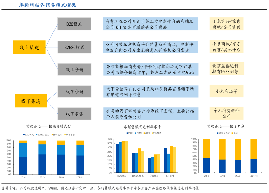 經(jīng)典案例:根據(jù)公司招股說明書、wind、國元證券研究所等綜合資訊表明,趣睡科技摒棄傳統(tǒng)線下銷售為主模式,通過線上渠道全覆蓋直接觸達終端消費者。相較于行業(yè)傳統(tǒng)線下銷售、ODM/OEM 大宗業(yè)務(wù)為主的模式,其已實現(xiàn)線上 B2C 和 B2B2C 為主,線上分銷為輔的線上渠道全覆蓋。2018-2021H1其線上渠道銷售在營收中的比重均超過97%(同行業(yè)可比公司線上銷售占比約為 10%-50%),其中 B2C 銷售模式占比均超50%。