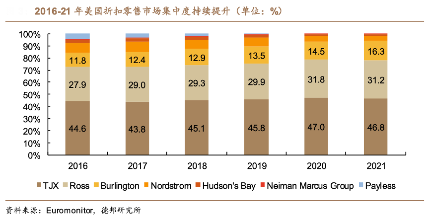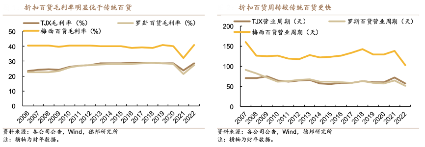 經(jīng)典案例:根據(jù)各公司公告、wind、德邦研究所等綜合資訊表明,折扣零售的代表包括美國的TJX、羅斯百貨,折扣零售的核心驅(qū)動力就在于性價比,通過專業(yè)選品團隊精選,并憑借連鎖經(jīng)營的規(guī)模壓低價格,與傳統(tǒng)百貨的差異在于毛利、周轉(zhuǎn)。