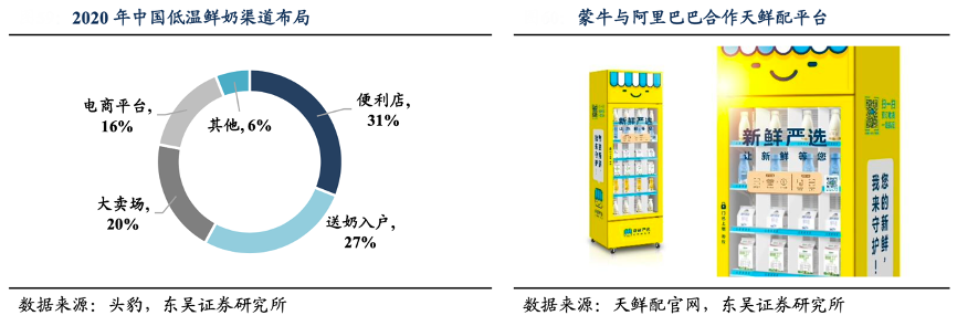 經典案例:根據頭豹、天鮮配官網、東吳證券研究所等綜合資訊表明,2018 年初,光明攜經銷商體系接入阿里巴巴零售通平臺,利用阿里巴巴零售通的技術建立數據化的管理系統;并于 2019 年與阿里 云達成合作,在新零售、支付、物流、智慧門店等方面推動數智化轉型。2019 年阿里巴巴入股蒙牛旗下訂奶 O2O 平臺“天鮮配”,打造了“線上平臺訂奶,樓下智能冰柜取奶”的新模式,滿足消費者對鮮奶的口感追求。