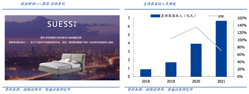 經典案例:根據招股說明書、國盛證券研究所等綜合資訊表明,慕思公司在保持與錦江系等酒店類客戶長期穩定合作外,不斷拓展直供渠道的客戶,2019 年與歐派家居達成戰略合作,聯合共創“慕思·蘇斯”品牌,僅供歐派全渠道銷售。2020-2021 年公司通過歐派家居的銷售分別達 2.88、 5.28 億元,營收占比達 6.5%、8.2%。