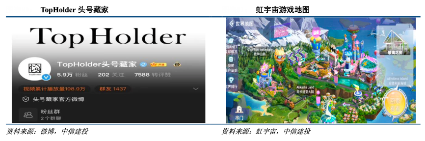經典案例:根據微博、虹宇宙、中信建投等綜合資訊表明,天下秀目前已推出 3D 虛擬社交軟件“虹宇宙”和自媒體數字藏品工具集“TopHolder頭號藏家”。“虹宇宙”已有紅人 IP 魚太閑、天才小熊貓等已入駐,與拉菲、龍湖集團等公司達成合作意向,自上線內測以來累計預約用戶已超過 40 萬;而“TopHolder 頭號藏家”已正式接入虹宇宙,并與微博達成戰略合作,為微博用戶提供原創數字藏品生成、發行、傳播及沉淀等服務。