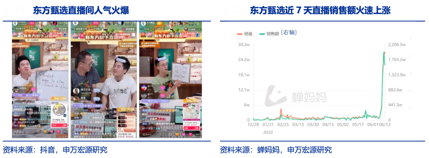 經典案例:根據抖音、蟬媽媽、申萬宏源研究等綜合資訊表明,6月 11 日新東方前英語老師董宇輝的一場牛排帶貨讓東方甄選直播間爆火出圈,單日銷售突破 2000 萬。據蟬媽媽數據,6 月 10 日至 13 日,東方甄選直播觀看人次均達 900 萬以上,6 月 13 日更是達到 1607.1 萬人, 抖音賬號粉絲從 110.8 萬人增長 242.5%至 379.5 萬人。東方甄選的出圈強勢拉動新東方股價上漲超 30%(6 月 14 日收盤價 VS 6 月 10 日收盤價)。