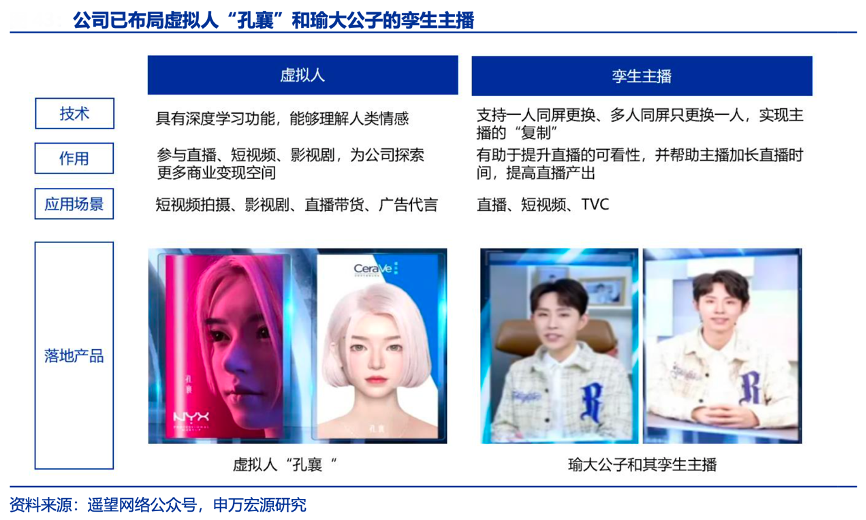 經典案例:根據遙望網絡公眾號、申萬宏源研究等綜合資訊表明,遙望網絡公司組建了 20 人的 CG 研發團隊在數字虛擬人領域進行研發與制作,2022 年 4 月,公司發布虛擬人“孔襄”,已與賈乃亮進行短劇合作,并接到適樂膚、薇姿、NYX 三個品牌的代言,數次登上社交媒體熱搜榜。