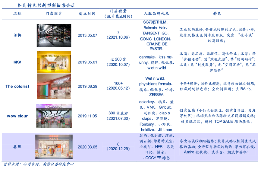 經典案例:根據公司官網、安信證券研究中心等綜合資訊表明,2019年后新型彩妝集合店興起,以THE COLORIST、WOW CLOUR、喜燃、話梅等為代表的新型美妝集合店主打“產品零售 +服務體驗”,通常開在人流密集的商場及購物中心的一層,裝修風格明亮絢麗、讓人眼前一亮,注重沉浸式購物,彌補了線上購物不能試妝的缺陷,受年輕人喜愛,成為“網紅打卡點”。