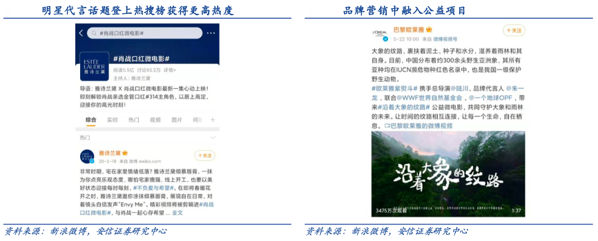 經典案例:根據新浪微博、安信證券研究中心等綜合資訊表明,明星代言有長期全線代言、細分產品線代言或短期合作等多種形式,以2019年肖戰代言雅詩 蘭黛為例,微博數據顯示,#肖戰口紅微電影#話題閱讀量達 5.5 億、討論量達 65.2 萬。同時,品牌推出限量定制款或聯名款,促進粉絲消費;當達到一定銷量后,品牌方會解鎖開屏廣告曝光、線下大屏投放、拍攝物料、公益活動等“福利”,提升粉絲黏性。