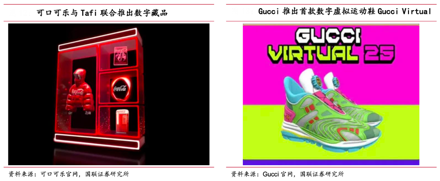 經典案例:根據可口可樂官網、Gucci官網、國聯證券研究所等綜合資訊表明,近年來,已有多個龍頭消費品牌通過發行 NFT 進行營銷推廣,如可口可樂與數字可穿戴設備設計平臺 Tafi 聯合推出了 NFT 數字藏品,Gucci 發布了首款數字虛擬運動鞋 Gucci Virtual 25,以及 2021 年天貓雙十一推出數字 藏品展,五糧液、自然堂、科顏氏等品牌均參與其中。