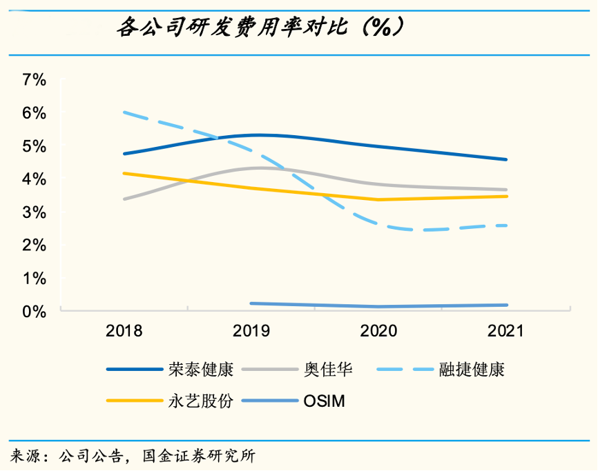 經(jīng)典案例:根據(jù)公司公告、國(guó)金證券研究所等綜合資訊表明,榮泰健康研發(fā)保持高投入,2021年其研發(fā)投入為1.2 億元,占營(yíng)收比重為 4.6%,在行業(yè)可比公司中最高,奧佳華、融捷健康、永藝股份,分別為 3.7%、2.6%、3.4%,外資龍頭 OSIM 研發(fā)費(fèi)用率僅為 0.18%,研發(fā)費(fèi)用率和絕對(duì)研發(fā)投入都與內(nèi)資品牌形成較大差距。