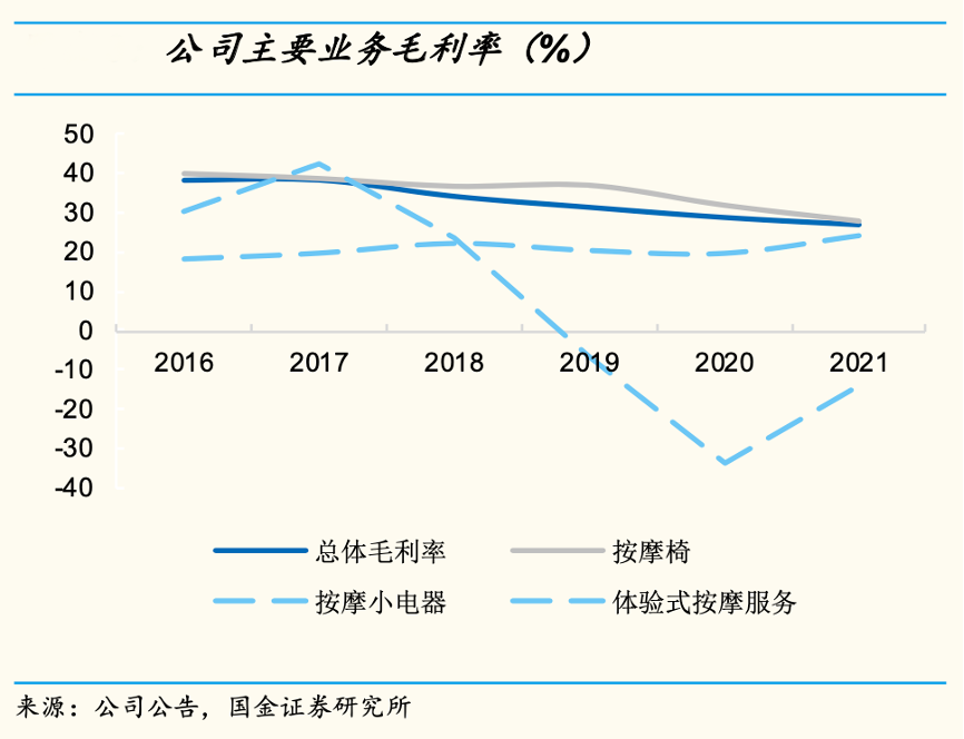 經(jīng)典案例:根據(jù)公司公告、國金證券研究所等綜合資訊表明,2020-2021年榮泰健康公司毛利率在27%左右,受大宗原材料影響較大(按摩電器原材料占成本比重 80%以 上),2021年按摩椅、按摩小電器、共享按摩椅毛利率分別為 27.8%、24.1% 和-14.0%,按摩椅盈利能力強(qiáng)。2018-2019 年毛利率下滑主要系毛利率較低的共享按摩椅業(yè)務(wù)高增長。