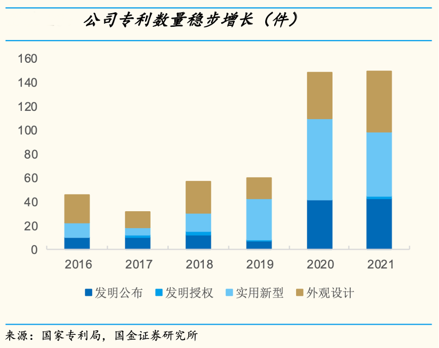 經(jīng)典案例:根據(jù)國家專利局、國金證券研究所等綜合資訊表明,2020-2021年榮泰健康公司專利數(shù)量顯著增加至150 件左右/年,其中含金量最高的發(fā)明專利(發(fā)明公布+授權(quán)) 數(shù)量快速上升。