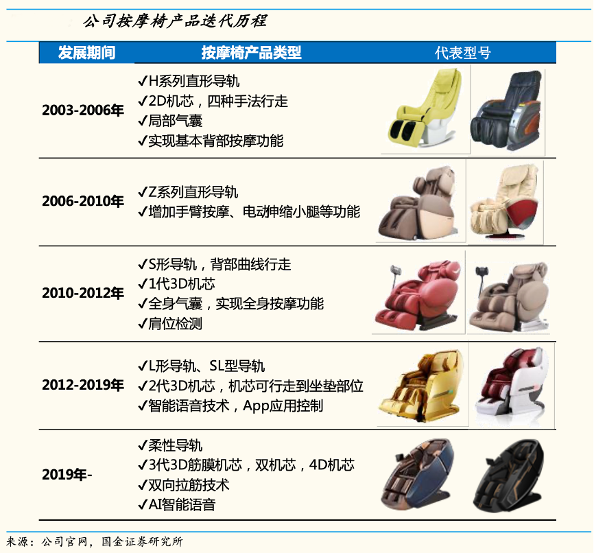 經(jīng)典案例:根據(jù)公司官網(wǎng)、國金證券研究所等綜合資訊表明,榮泰健康公司產(chǎn)品經(jīng)歷5次迭代,領(lǐng)先行業(yè)1-2 代。尤其是在機芯方面,其經(jīng)歷從 2D 機芯到 3 代 3D 機芯,從單機芯到雙機芯配置的演進(jìn),2019年進(jìn)一步推出4D 機芯,通過上下按摩球雙向運動,使按摩力度滲透至肌肉深層筋膜。