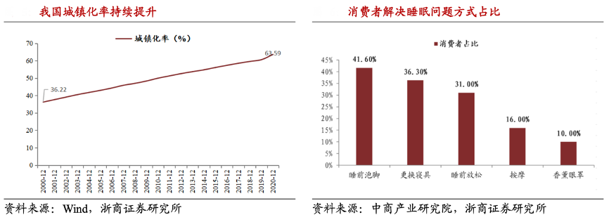 經典案例:根據wind、中商產業研究院、浙商證券研究所等綜合資訊表明,城鎮化有助于床墊的普及: 第七次人口普查城鎮化率當前中國城鎮化率為 63.59%、仍有較大提升空間。同時,消費習慣變化帶動床墊滲透率提升:根據《2020 中國睡眠指數報告》,36.1%的消費者面臨失眠的問題,其中36.3%的消費者會選擇通過購買寢具來解決睡眠問題,消費者對睡眠的重視和對床墊產品的認知都在不斷加深。