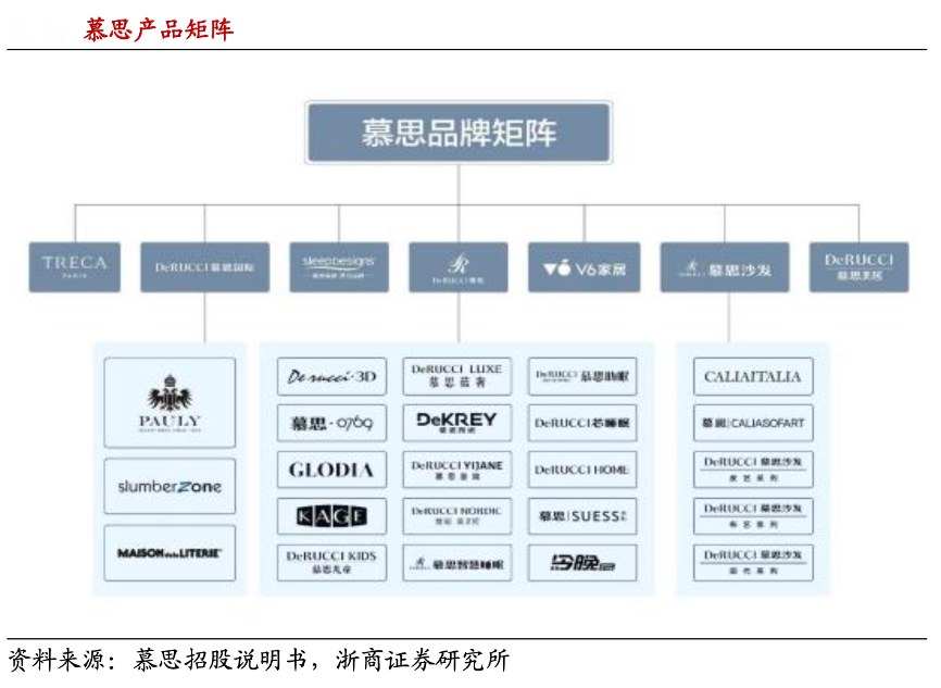 經典案例:根據慕思招股說明書、浙商證券研究所等綜合資訊表明,慕思構建全覆蓋的產品矩陣,可滿足不同用戶定制化的睡眠需求。目前已形成 7 大 主力品牌,包括“慕思”、“V6 家居”、“崔佧(TRECA)”、“慕思國際”、“思麗德賽(Sleep Designs)”、“慕思沙發”和“慕思美居”,構建了完整的中高端及年輕時尚品牌矩陣,可滿足消費者定制化的健康睡眠需求。