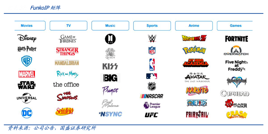 經典案例:根據公司公告、國盛證券研究所等綜合資訊表明,Funko 產品產品矩陣縱向搭建品牌類型——POP!、Loungefly以及其他品牌,橫向構建產品類型——人偶以及其他衍生品(服飾、文創等),通過大量國際化 IP 填充矩陣內容,拓寬領域延伸產品產業鏈。Funko產品授權涵蓋影視、音樂、體育、游戲、動漫多 領域的頭部IP,其中漫威、哈利波特以及曼達洛人系列常居 2021 各季度 TOP3。