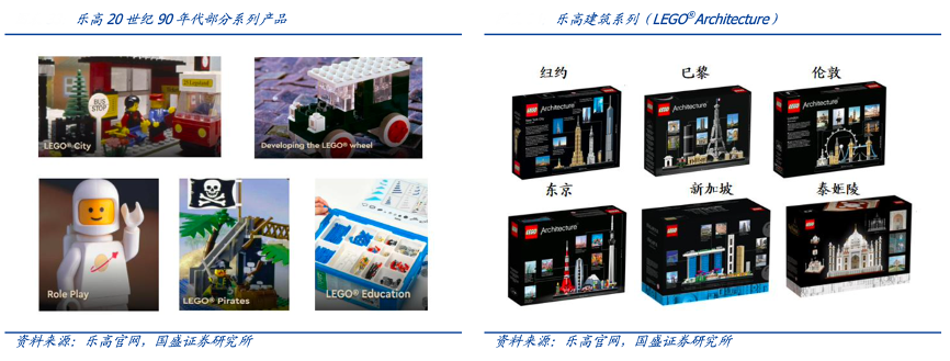 經典案例:根據樂高官網、國盛證券研究所等綜合資訊表明,2001-2002年兩年間,星球大戰和哈利波特兩大 IP 的熱銷帶動了樂高該系列一炮而紅,成為樂高系列中的常青樹。同時2007 年樂高與芝加哥建筑師亞當〃里德〃塔克(Adam Reed Tucker)合作,通過復刻世界各地標志建筑,研發出樂高建筑系列(LEGO® Architecture)。差異化產品的同時也促進樂高本土化,促進樂高文化和當地文化的融合。