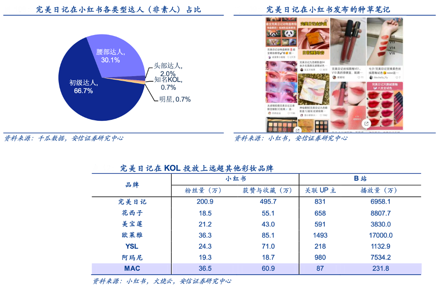 經典案例:根據千瓜數據、小紅書、火燒云、安信證券研究中心等綜合資訊表明,完美日記在 KOL 的選擇上采用“金字塔”結構,即少量明星和頭部 KOL(粉 絲數>50 萬)+中量腰部 KOL(粉絲數 5-50 萬)+大量初級 KOL(粉絲數<5 萬),頭部 KOL 提升品牌影響力,腰部和初級 KOL 配合度高、營銷費用較低卻也更拉近和消費者之間的距離。截至 2021 年 11 月,完美日記在小紅書擁有粉絲 200.9 萬,遠超其他彩妝品牌。