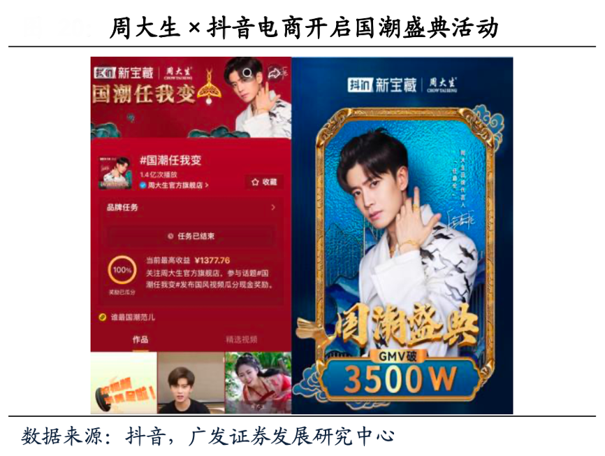 經典案例:根據抖音、廣發證券發展研究中心等綜合資訊表明,周大生自2021年起布局“站外種草+平臺直播轉化+私域精細化運營”的年輕態營銷戰略,發力抖音、小紅書等新興社交電商和興趣電商渠道;4月聯動抖音電商“抖in新寶藏”開展國潮盛典活動,進行總裁直播、達人直播,達成平臺聲量超2.2億,GMV 3500萬;“#國潮任我變”抖音話題曝光破1.2億,參與人數超3.1萬,店鋪粉絲增長超16萬。