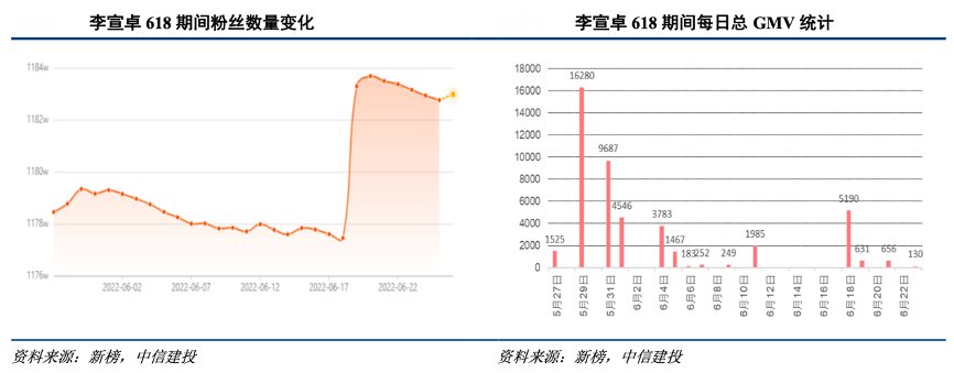 經典案例:根據新榜、中信建投等綜合資訊表明,李卓宣自2019 年在快手上線,開啟明星+帶貨的直播形式。李卓宣的定位是深耕內容領域,目標客戶主要為 24-30 歲男性用戶,2021年8月李宣卓拜入中國白酒釀造專家陳尚智門下,2022年快手 616 實在購物節期間前往河北劉伶醉酒廠,為粉絲進行深度溯源,5月29日的3場直播達到共計 1.6 億 GMV。
