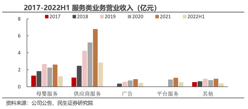 經(jīng)典案例:根據(jù)公司公告、民生證券研究院等綜合資訊表明,孩子王公司在母嬰商品的基礎(chǔ)上提供母嬰服務(wù),推出童樂園、互動活動、育兒服務(wù)等各類母嬰童服務(wù)及黑金會員服務(wù),同時還與供應(yīng)商合作,展開會員開發(fā)、互動活動冠名、商品線上線下推廣宣傳等活動,打造出差異化競爭力,2021年公司母嬰服務(wù)營收為 2.58 億元,yoy+16.38%;營收占比 2.85%, yoy+0.19pcts。