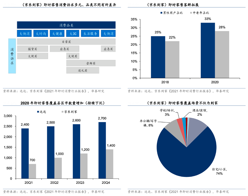 經典案例:根據達達、京東到家《2021年即時消費行業報告》、華泰研究等綜合資訊表明,即時零售正逐步向全訴求、全客群、全地域、全場景發展,據達達、京東到家聯合發布的 2021 年 6 月發布的《2021 年即時消費行業報告》,74%的消費者選擇京東到家的理由主要是“日常才買,快些更好”,且不同品類的消費訴求各不相同。即時零售的覆蓋面也日益擴大,表現在客群由年輕女性向男性和中老客戶拓展、城市由一二線向低線城市下沉、消費場景由到家向辦公酒旅進行延伸。