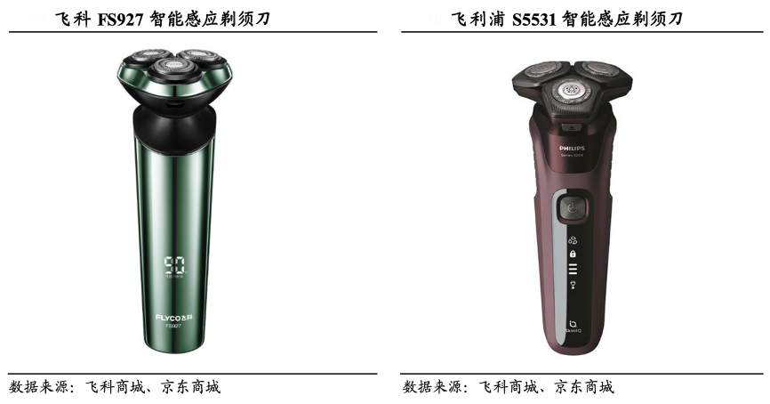 經典案例:根據飛科商城、京東商城、國泰君安證券研究等綜合資訊表明,電動剃須刀的智能化主要體現在智能顯示和智能感應兩個方面,智能感應技術通過搭載須發傳感器,根據須發情況實時優化調節馬達轉速。2020 年飛利浦與飛科分別發布了智能感應剃須刀 SkinIQ 肌能感應科技系列產品和 FS927 智能感應剃須刀,隨后松下、博 朗等品牌也陸續發布了旗下自動感應剃須刀產品。而新消費品牌玩家尚未在該類產品上獲得有效突破。