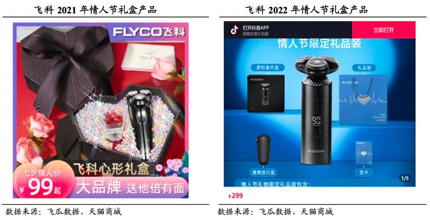 經典案例:根據飛瓜數據、天貓商城、國泰君安證券研究等綜合資訊表明,對比飛科公司 2021 年和 2022 年情人節 禮盒產品,我們看到產品設計創新的升級。相較于 2021 年情人節禮盒較為單一的產品類型,飛科公司2022年推出的“太空小飛碟”剃須刀和“星空”自動感應剃須刀在產品外型和功能方面取得突破,產品單價大幅提升。